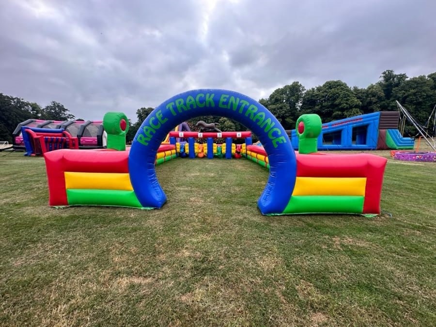 Each setup includes inflatable horses, race markers or tracks, safety mats, and full professional setup. Optional extras include